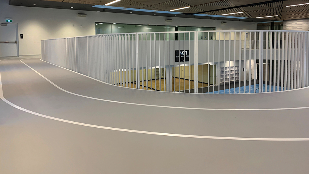 Advantage Sport installed a PolyTurf Plus Pad & Pour (9+2) system throughout both the gymnasium and walking track, featuring custom colours selected from Pantone and Benjamin Moore palettes.