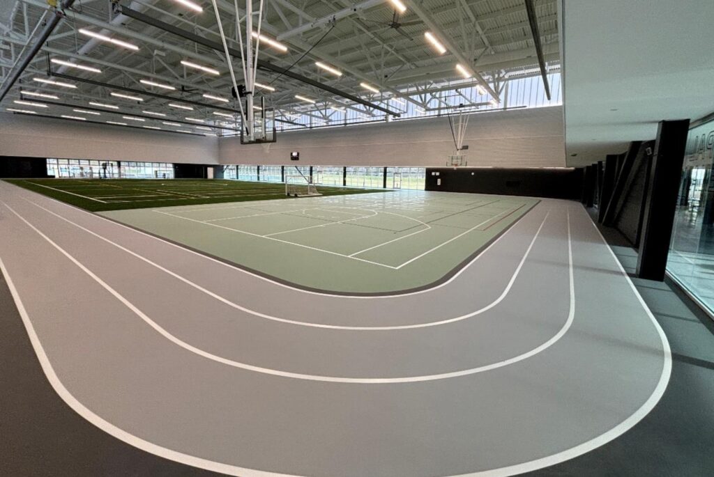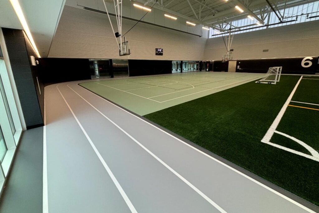 Advantage Sport installed a PolyTurf Plus Pad and Pour (9+2) system across approximately 11,600 square feet, incorporating a multisport court and a three-lane indoor walking track.