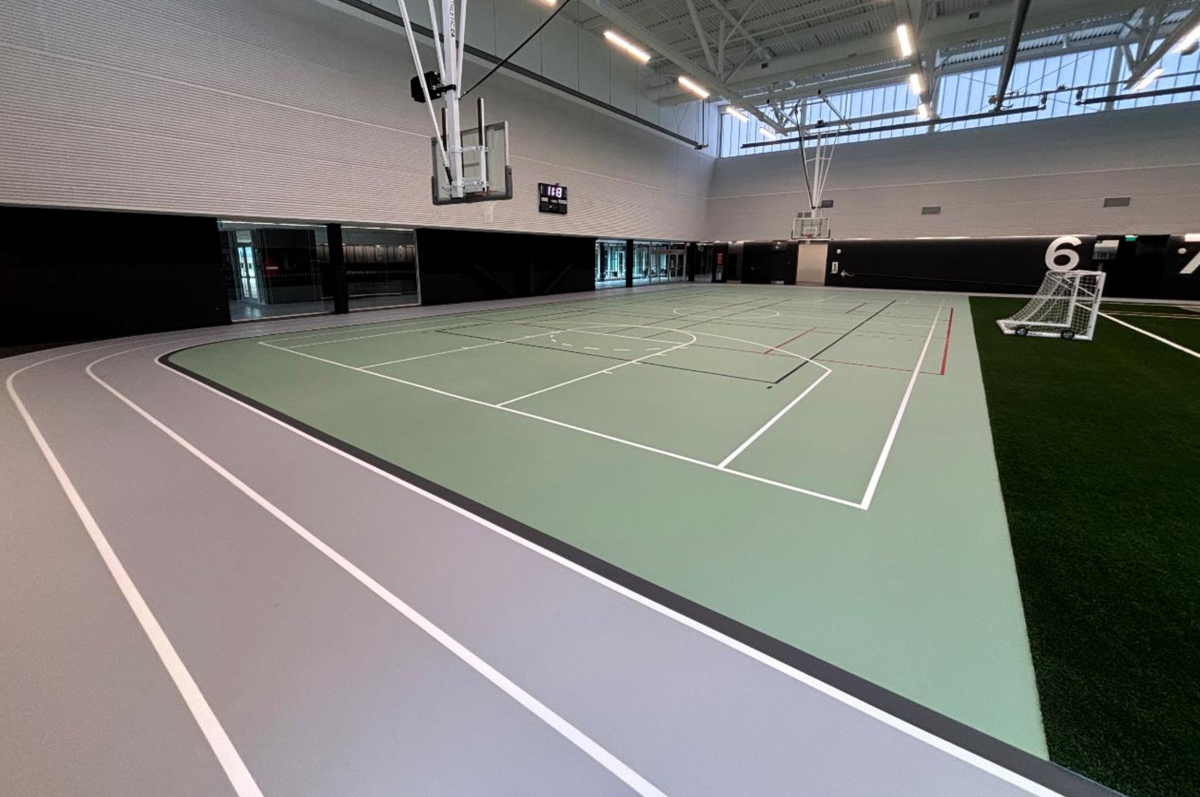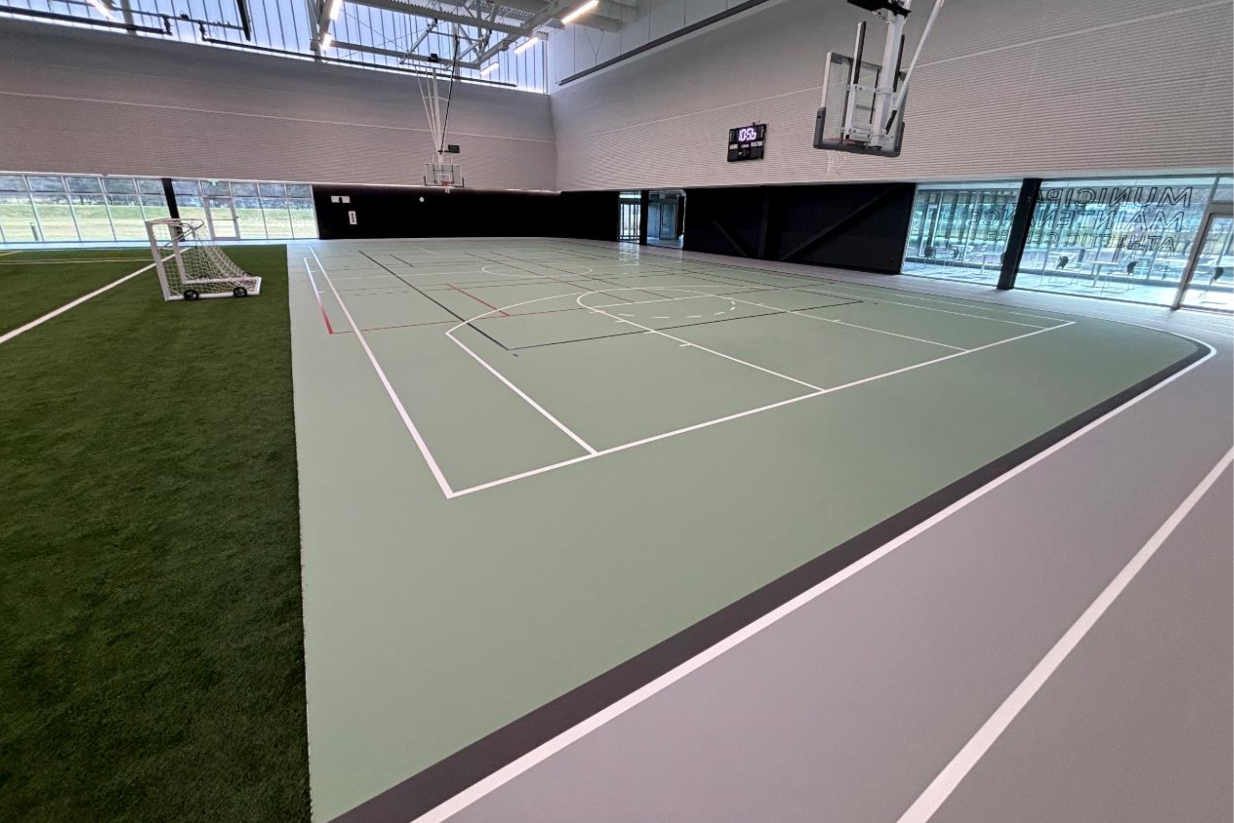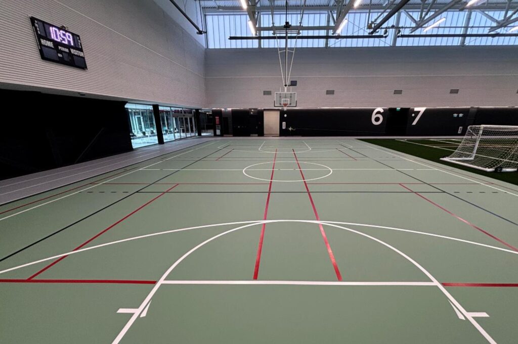 The green colour was selected to complement the adjacent turf area, creating a cohesive visual transition and a modern aesthetic throughout the indoor sports complex.